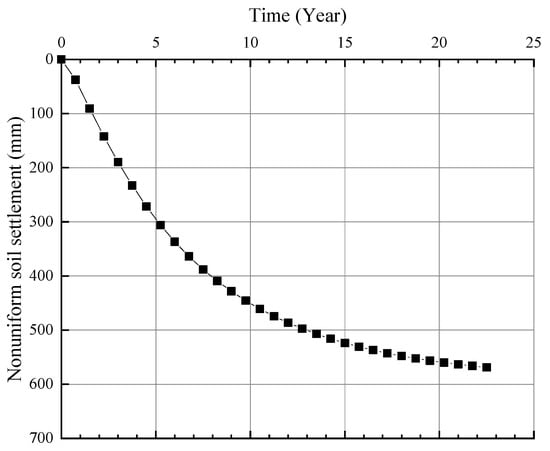 Figure 9 shows that when the pile enters Layer 8 (silty sand), the subsidence of the pile itself is small, while the soil layer around the pile produces large consolidation subsidence under the additional stress caused by the self-weight and pile side resistance, resulting in nonuniform subsidence between the pile and soil, and the final nonuniform subsidence reaches 560 mm. In the first five years after the pile is driven, the nonuniform subsidence of the pile and soil develops rapidly. The nonuniform subsidence reaches approximately 300 mm, and the nonuniform subsidence rate is approximately 60 mm/a. Then, the nonuniform subsidence rate slows and becomes stable.