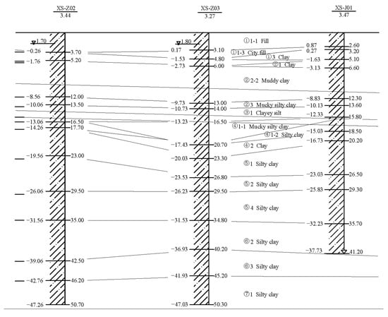 As most cities in China take measures to limit or prohibit the exploitation of groundwater [] and the scale of urban engineering construction continues to increase, the problem of land subsidence around engineering projects has become increasingly prominent. Ningbo is a Chinese city with serious land subsidence, which was initially attributed to the long-term massive exploitation of groundwater. However, with the prohibition of groundwater overuse, the continuous expansion of the urban construction scale, the formation of a large number of high-rise buildings and the rapid development of rail transit, land subsidence caused by ground loading and deep foundation pit engineering has become a new factor [,]. Additionally, the deep soft soil widely existing in Ningbo [] has further aggravated land subsidence around engineering projects. The geotechnical properties of soils with different bearing values and plasticity [,] at different depths show different impacts on major infrastructure. Regarding the widespread soft soil in Ningbo, previous studies on specific research objectives have depended on empirical judgments of the soil properties.