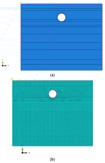 Plane strain finite element model of the metro tunnel. (a) Finite element model. (b) Mesh division.