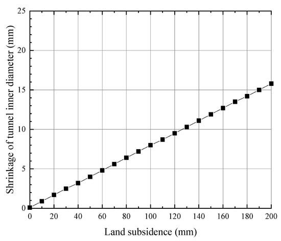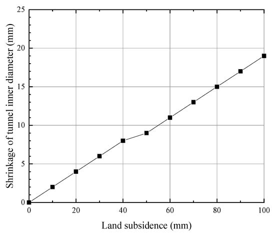 The relationship curve between the vertical shrinkage of the tunnel inner diameter and the land subsidence was calculated, as shown in Figure 12. In this range of land subsidence, the relationship between the tunnel inner diameter shrinkage and the land subsidence is basically linear. According to “Technical Specifications for Urban Rail Transit Engineering Inspection” (GB 50911-2013) [], the control value of shield tunnel segment headroom shrinkage is 0.2% D. In this case, the corresponding land subsidence value was approximately 67 mm, which means that the shrinkage of the tunnel headroom reaches the upper limit of the specification.