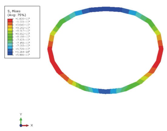Figure 13 shows that the tunnel inner diameter converges vertically and expands laterally under the formation pressure. At this time, the von Mises stress contour diagram of the tunnel segment shows that the von Mises stress peaks at both ends of the horizontal segment are at approximately 1.04 MPa, which is less than the tensile strength of the concrete. The segment does not crack, but the connection between segments may be damaged.