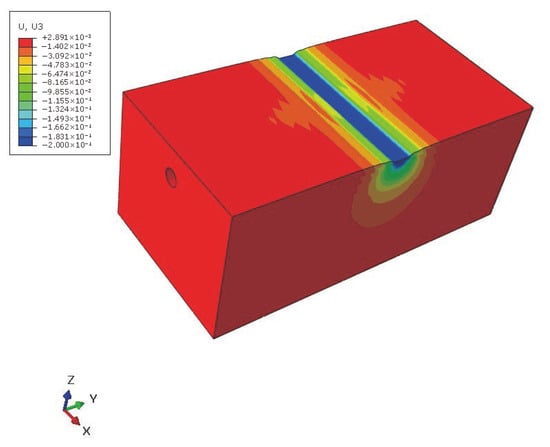 Figure 14 shows the vertical displacement of the stratum when 200 mm settlement occurs within a width of 1D at the axial center of the tunnel. Figure 15 shows the contour diagram of the vertical displacement and stress of the tunnel segment. The relationship curve between the shrinkage value of the tunnel inner diameter and land subsidence can be obtained as shown in Figure 16.