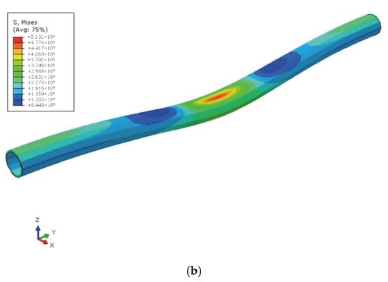 According to the tunnel clearance shrinkage limit of 0.2% D specified in “Technical Specifications for Urban Rail Transit Engineering Inspection” (GB 50911-2013) []. The corresponding ground settlement is 156 mm. At this time, the von Mises stress contour diagram of the tunnel segment is shown in Figure 15b. The von Mises stress of the segment at the center of the settlement trough is the largest, reaching approximately 5.1 MPa, which far exceeds the tensile strength of the concrete. This segment is likely to crack, and the connection between segments may also fail.