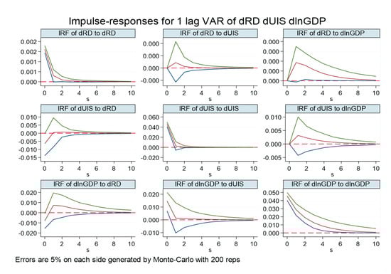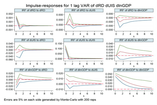 The above results show that when R&D investment (dRD) is the dependent variable, the effect of R&D investment with one period lag on itself is not significant in the national, central, and western regions, while the effect on the eastern region is significant at the 10% level, which proves that the R&D input in the east coastal region is stronger and the utilization rate of technology transformation is higher, which also reflects that the intensity of R&D input in the last period in different regions has different impacts on the current R&D. Industrial structure rationalization with one period lag has a suppressive effect on R&D input in the western region, but the effect is not significant in the eastern region; meanwhile, the development of industrial structure rationalization increases the R&D input intensity in the central region. In the central region, the economic growth of lag order 1 has a notable positive impact on R&D investment.