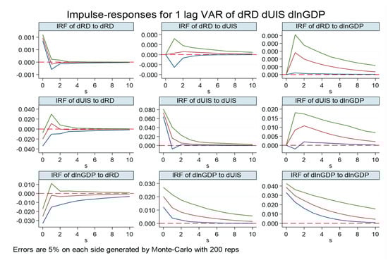 To deepen the study of the dynamic interaction among R&D investment, industrial structure rationalization, and economic growth, impulse-response analysis can be used to examine the change in the time path of other variables following a shock to one of the individual variables. The impulse-response function is a mechanism that measures the dynamic impact of a variable on an orthogonal shock to another variable. A standard deviation shock is given to R&D investment, industrial structure rationalization, and economic growth in the base period, and the duration of the shock is 10 periods; here, 200 simulations are conducted using the Monte Carlo method to obtain the impulse-response images of each variable shock in the period 0–10. The results are shown in Figure 3, where the red line is the impulse-response curve and the outer green and blue lines are the 5% and 95% confidence interval lines, respectively.