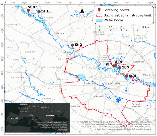 The map of the Colentina River with the sampling stations (the red dots represent the limits of Bucharest). (Sources: Esri, HERE, Garmin, FAO, NOAA, USGS, ©OpenStreetMap contributors, and the GIS User Community).