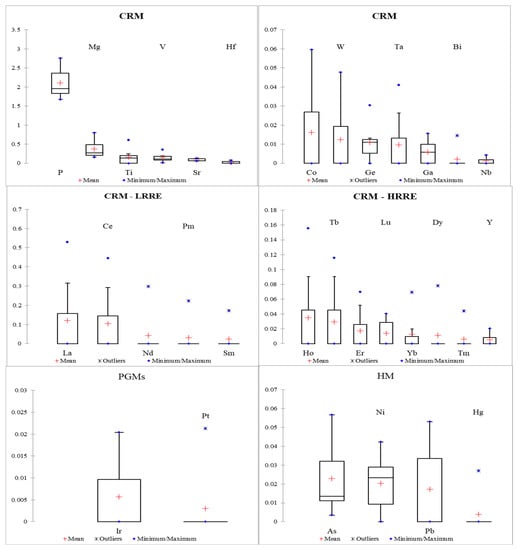 Boxplots (minimum, maximum, mean, and outliers) represent the critical raw material and heavy metal categories in P. australis from the studied sites. The CRMs follow the EU list, with other critical elements and separately Rare Earth Elements (REE) (with heavy and light REE) and Platinum Group Metals (PGMs). The elements from the box plots are presented in descending order of concentration (in mg kg−1).