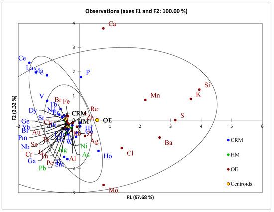 The discriminant analysis, based on the CRMs, HMs, and OE elements, offers a better understanding of the contribution in the P. australis ash samples through the differentiation between groups. Regarding the CRMs, the generated ellipse is evidently a scatter, from the point of view of the higher concentrations of the elements. Thus, caesium (Ce), lanthanum (La), magnesium (Mg), phosphorus (P), vanadium (V), sulfur (S), holmium (Ho), and titanium (Ti), noted for their higher values, made an important contribution to the group. HM represented the group of elements whose concentrations were reduced compared to the other two categories, thus being highlighted by the small ellipse in the analysis. The largest ellipse belonged to the other elements group, which had the greatest diversity both in elements and concentrations. However, in addition to the major elements such as macrominerals calcium (Ca), chlorine (Cl), silicon (Si), potassium (K), and mangan (Mn), other less common elements such as silver (Ag), molybdenum (Mo), barium (Ba), and rhenium (Re) were also noted (Figure 3).