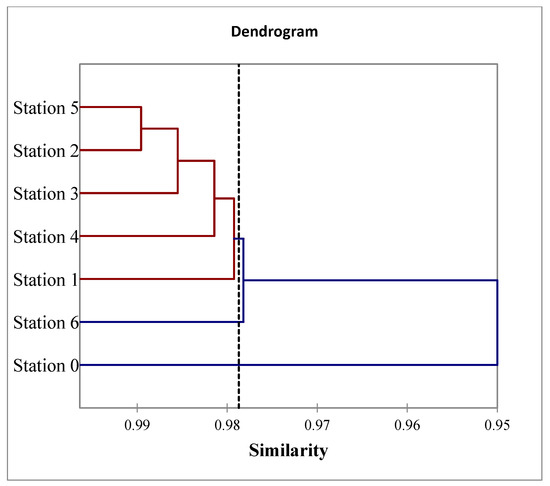 The element content of the P. australis ash showed through AHC a grouping of the studied areas related to the anthropogenic influence (Figure 4). Thus, the unmodified river areas outside urban areas, represented by stations 0 and 6, were differentiated into 2 clusters separate from the other stations. Additionally, the dendrogram that included the rest of the stations was also branched into different degrees of similarity as follows: Peri-urban stations 2 and 5 presented the highest similarity, secondary linked with stations 3, 4, and 1. The positioning of stations 1, 3, and 4 in the cluster emphasized the particular features of the selected areas. Thus, station 1 was the transition station between the peri-urban and rural areas, while stations 3 and 4 belong to the urban region of the river.