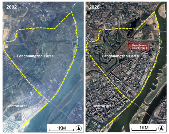 Satellite images of part of the new district taken in 2002 and 2020 (adapted from Google Earth Pro, Image© 2022 Maxar Technologies).