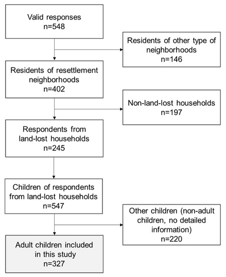 Additionally, the resettlement pattern of land-lost farmers (i.e., collective resettlement housing) may also have resulted in residential segregation from other urbanites. There are considerable disparities in socioeconomic status between land-lost households living in resettlement housing and other urbanites. Land-lost farmers also reported being prejudiced against by other urbanites [10]. Furthermore, the residential environment of collective resettlement housing is often not as favorable as other residential communities. Yet, even if land-lost farmers are dissatisfied with living conditions, they may not have the ability to move out from the resettlement housing because of financial reasons. A recent study suggested that this socio-spatial segregation may be exacerbated because of the stigmatization effects of resettlement housing [11]. Thus, understanding the economic and spatial integration mechanisms of land-lost farmers is essential for sustainable urbanization and social justice in China. Although the changes in the socioeconomic status of land-lost farmers after land expropriation have been examined by prior studies, little is known about their long-term outcomes, including the integration of their offspring.