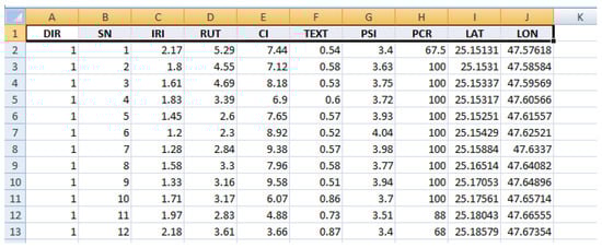 - International Roughness Index(IRI): IRI is a measure of longitudinal roughness of the road, and an indicator of ride quality, safety, and road user cost. The United State Federal Ministry of Highway and Administration (FHWA) recommends an acceptable range of IRI between 1.5 to 2.76 m/km [52]. Similar range and scaling of IRI is employed by highway agencies in Saudi Arabia [53]. Any road section with IRI below 1.5 m/km can be considered to be in good condition.