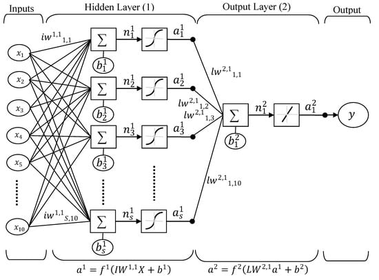 A two-layer (excluding the input) feed forward NN was coded in MATLABTM (R2017a). Although ANN models are categorized as black boxes due to low interpretability of model structure, they yield astounding prediction performance compared to conventional modeling techniques [57,58]. The architecture of the NN utilized in this study is presented in Figure 3. All ten indices of L3 were considered as input to predict PC index of L2 or L1. Sensitivity analysis was later conducted to assess which of the variables played more significant role in the model performance. Attempt was made to create NN models with two out puts (L2 and L1 indices), but the resulting models’ accuracies were comparably lower than those of single out put models. S represents the number of neurons in layer 1, and varies for the various predicted indices. The weight and bias matrices are denoted by W and b, respectively. The transfer function is a hyperbolic tangent sigmoid equivalent function given by (5). Each of the variables from the input matrix X, is connected to each neuron through the weight matrix . In this case, is a 10-element column vector formed by “” from the weighted sum of the input variables and bias of the neurons’ outputs. The neurons’ outputs serve as inputs to , which transforms inputs to fall between the interval of [−1, 1]. The second layer function ‘’ is a linear transfer function that normalizes the outputs from , which is then reversed by Equation (6), to be compared to the target output ‘’. Due to the random nature of the data, Bayesian Regularized (BR) Levenberg–Marquardt optimization was selected as the training algorithm [59,60]. The Bayesian Regularized Neural Networks are difficult to over-train, over-fit, and validation process is unnecessary [61]. The model performance is evaluated in terms of Mean Square Error (MSE) given by Equation (8), and coefficient of correlation (R2) between actual and predicted PC given by Equation (9). However, for easy assessment and evaluation of model accuracy, the Root Mean Square Error (RMSE) of the training and testing outputs was reported. Number of neurons for each model was optimized based on lowest and highest obtainable MSE and R2 values, respectively. Balanced performance output between training and test data set was ensured by randomly reshuffling training/test data sets until approximately equal MSE and R2 are obtained.