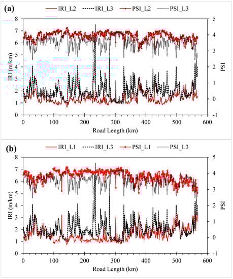 IRI and PSI Plots of (a) Lane-2 vs. Lane-3, and (b) Lane-1 vs. Lane-3.