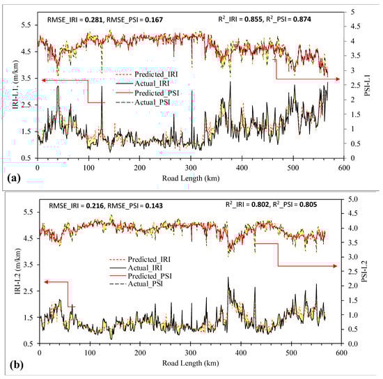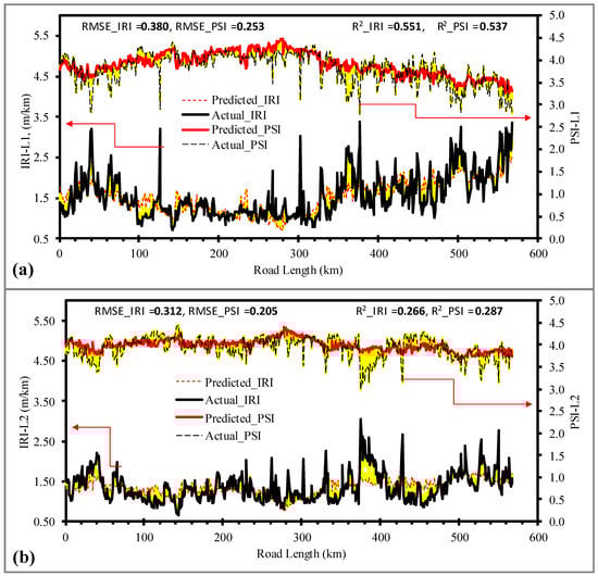 The predicted vs. actual plots showing margin of error for IRI and PSI of L1 and L2 are shown in Figure 5a,b, respectively. The RMSE of the IRI-L1, IRI-L2, PSI-L1, and PSI-L2 plots are 0.380 m/km, 0.312 m/km, 0.253, and 0.205, respectively. These values are not too high if the intervals of the IRI or PSI needed to classify a pavement section as acceptable or otherwise are considered. However, these level or errors cannot be accepted practically because they are associated to high uncertainties. This can be observed from the various margin of error between true and predicted IRI/PSI in the plots. Although most of the predicted values showed reasonably low deviations from the true values, a significant amount of the pavement sections that have an unacceptable level of IRI or PSI were predicted to be in good condition. The correlation coefficients of the various plots for IRI-L1, IRI-L2, PSI-L1, and PSI-L2 are 0.551, 0.266, 0.537, and 0.287, respectively. The R2 values give insight into the generality of the prediction models. The more R2 is closer to unity the more general the model. For example, the RMSE observed might have downplayed the deficiencies of the various models, but the true and predicted correlation coefficients showed how these models become more inaccurate at extreme ends of the ranges of the utilized data. This was why the models could not capture the IRI and PSI at the extreme peaks and troughs of the plots. Significant difference in error margin could not be visually observed between plot in Figure 5a,b for L2 and L1, respectively. This because although IRI and PSI models of L2 showed lower R2 than those of L1, the models of L2 possessed lower RMSE than those of L1. Similar plots of CI vs. Texture and Rut vs. PCR for L1 and L2 are presented in the Appendix A as Figure A2 and Figure A3, respectively, for further information.