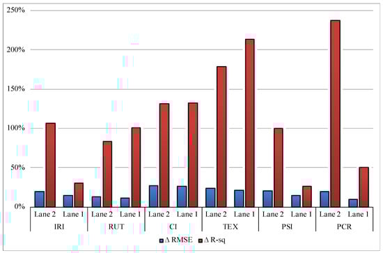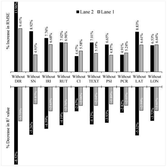 Percent change in RMSE and R2 values of the IRI ANN models due to exclusion of individual predicting variables from the models are shown in Figure 8. This represents the relative influence of the variables with respect to the accuracy of the ANN model. A variable that results in a higher drop in the accuracy of the model is considered a crucial and influential factor in the model. It can be observed that exclusion of any of the predicting variable from the models of both L2 and L1 resulted in increase in RMSE and a decrease in R2 value. However, the resulting change in RMSE was higher than that of R2 value. The magnitude of the observed change in RMSE and R2 for the different variables are also not the same for the different lanes. Increase in RMSE and decrease in R2 is a clear indication of decrease in overall model performance. This implies that all the included predicting variables, i.e., the PC of L3, contributed positively in the IRI model performances of both L2 and L1. The traffic travel direction parameter ‘Dir’ contributed the most to the RMSE and the R2 of the IRI ANN model. The traffic direction parameter ‘Dir’, the adjacent lane sections matching number (SN), and location parameter played a vital role, without which the data will be less meaningful to the ANN algorithm. This is because the PC variation between adjacent lanes, along the length of the road, and for different direction is not uniform (see Figure 4). Similar results of change in RMSE and R2 value of other PC models for L2 and L1 are summarized and presented in Table 7. The average corresponding RMSE and R2 values are presented in Appendix A in Table A1. Most of the observations made in the case of the IRI models are common to other PCs models, except PCR. Exclusion of a variable should either cause a decrease or an increase in the PCR model performance. The change in RMSE in the PCR models is also relatively low as compared to other PC models. This difference can be associated with the inability of the PCR model to perform as compared to the other PC indices. Excluding any predicting variable from the other PC models affects the model performance negatively. The negative effect of predicting variable exclusion can either be significant or less. The predicting variables were ranked according to their relative influence on the model performance, and the results is summarized in Table 8. The rank #1 represents the most influential, while rank #10 signifies least influential. The ranking was made on the absolute sum of change in RMSE and R2 due to the exclusion of the variables. It can be observed that the traffic direction parameter consistently remained the most influential predictor for the PCs of both L2 and L1, with only the exception of PCR. Average or overall rankings for the different lanes PC models were obtained from the total absolute sum of changes in RMSE and R2 due to variable exclusion. Due to inconsistent outcomes of PCR results as previously observed, results of PCR model were not included in the overall average ranking.