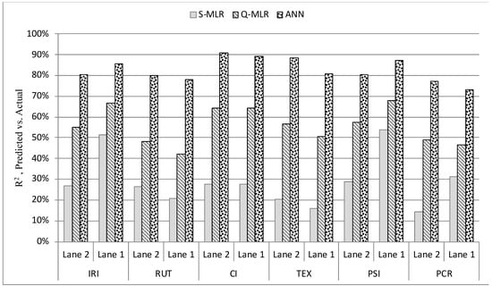 - On the other hand, the ANN models showed promising performances that indicates the possibility of evaluating a multi-lane highway PC by single lane inspection. The gap in R2 between ANN and S-MLR models ranges from 34% up to 68%, and from 19% to 36% relative to Q-MLR models.