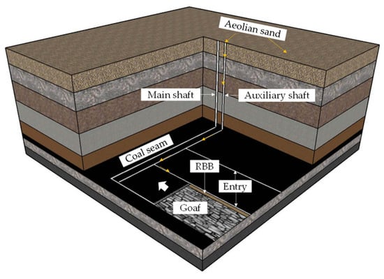 The gob-side entry retaining (GER) technique enables pillarless coal mining by using a roadside backfilling body (RBB), which can effectively reduce the roadway-driven ratio, improve the resource recovery rate, and has significant economic and environmental benefits (Figure 1) [,]. Flexible formwork concrete and cement mortar have higher strengths but lower vertical deformation capacity. Therefore, such backfill materials hardly meet the requirement for a large deformation capacity of RBB for GER. On the other hand, high-water backfill materials have the benefits of having high early strength, high flowability of single slurry, fast setting of mixed slurry, and high bearing capability after a large post-peak deformation. Besides, such backfill materials were incompressible under triaxial compression and better adapted to the underground goaf environment, which was usually cold, damp, and enclosed []. Given the above discussion, high-water backfill materials are believed to be ideal for the RBB.