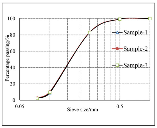 The CSA cementitious grout material was provided by Yangzhou Zhongkuang Construction New Material Technology Co., Ltd. (Yangzhou City, China). The high-water backfill material was composed of two main ingredients, A and B. It mainly consisted of sulfate aluminum cement, a suspending agent, and a set retarder. B was a mixture of lime, gypsum, a suspending agent, and an early strengthener []. The initial setting time was short after combining slurries A and B. Besides, the test sample developed sufficient strength within a short period. Therefore, such materials have the benefits of not causing pipeline blockage and have easy pumpability, high early strength, and environmental friendliness, with extensive application in mine backfilling, leak stoppage, and fire retardancy. The aeolian sand used for experiments came from the Kumtag Desert, one of the main deserts of northwestern China. We conducted grain size distribution on aeolian sand according to ASTMC136/C136M []. The cumulative grain size distribution curve (Figure 2) shows that the aeolian sand grain distributions were mainly between 0.075 mm and 0.25 mm. These grain sizes accounted for about 90% of the total mass, while the remaining were 0.25 to 1.0 mm.