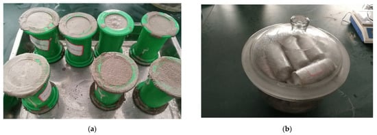 Next, we prepared the MBM samples (Figure 3). Material slurry A had aeolian sand mixed at a specific ratio. Material B slurry had added water adequately mixed. Finally, slurry A was doped with aeolian sand combined with the slurry B doped with aeolian sand, mixed for 5 min, and was left to stand still. The mixed slurry was poured into a mold and cured for 24 h before demolding. The test sample was covered with a preservative film and placed in an enclosed container. The subsequent tests began after 7 d of maintenance.