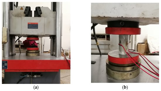 Our main discussions were on the influence of doping aeolian sand and the water−cement ratio on the physical and mechanical characteristics (e.g., initial setting time, unconfined compressive strength, and microstructure). The setting time of MBM should meet the requirements for the filling process for GER. If the setting time is too short, pipeline obstruction quickly happens, which will not be conducive to material transport. If the setting time is too long, MBM might not be easily formed in the goaf, thus failing to achieve the backfilling purpose. Therefore, the control of the setting time is of high importance. The Standard Vicat needle test for all test samples was as per GB/T1346-2001 []. We took the average initial setting time from two repeat tests on the same sample. When used to backfill the space underground, MBM was usually squeezed between the roof and floor of the coal seam. Therefore, the backfill body was subjected to uniaxial loading. The uniaxial compression test was crucial for the backfill material. We conducted the classical loading tests on MBM using the WAW-600D Hydraulic Universal Testing Machine. As shown in Figure 4, four strain gauges (SGs) were installed at the mid-height of each sample to measure axial and circumferential strains and the overall axial deformations of the samples. According to ASTMD7012-2010 [], we used a loading rate of 1.5 mm/min for the compression test in all samples under the displacement loading mode. In order to understand the microscopic characteristics, we observed the morphology of MBM using the ZEISS LEO-1430 VP scanning electron microscope (Carl Zeiss AG, Jena, Germany).