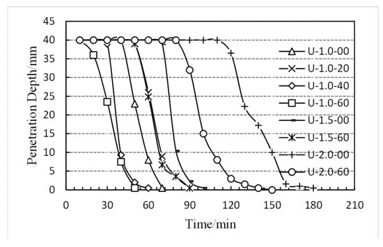 The standard Vicat needle test results are shown in Figure 5. As shown in Figure 5, doping aeolian sand would affect the initial setting time of MBM. With the doping amount of aeolian sand fixed at 60%, the initial setting times of the samples with the water−cement ratio being 1.0, 1.5, and 2.0 were shortened by 50%, 26%, and 30%, respectively, compared with those not doped with aeolian sand. When the water−cement ratio was fixed at 1.0, the initial setting time of the samples was 43 min, 53 min, 33 min, and 21 min when the doping amount of aeolian sand was 0%, 20%, 40%, and 60%, respectively. It is noteworthy that the initial setting time of the MBM decreased with the increased doping amount of aeolian sand and decreased with the water−cement ratio. It is logical that adjustment of the initial setting time by changing the doping amount of aeolian sand met the technical requirements of the construction of RBB.