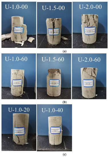 The failure modes from the various tests of MBM are in Figure 6. As shown in the figure (Figure 6a,c), for the pure high-water materials (e.g., U-1.0-00, U-1.5-00 and U-2.0-00) and at a small doping amount of aeolian sand (e.g., U-1.0-20), failure first occurred at one end of the sample. Then, the cracks gradually propagated from the middle to the other end of the sample. Thus, a sharp tensile crack was formed, causing the failure of the entire sample. As the doping amount of aeolian sand continued to increase (Figure 6b,c), the sample underwent axial compression and radial expansion due to pressure from above. The friction at the end of the testing machine resulted in a three-way stress zone in an inverted cone shape at the top of the testing machine, where an X-shaped crack zone developed. With sustained axial pressure, a shear fissure intersecting with the axial line appeared in the lower part of the X-shaped crack zone. This fissure became a macroscopic crack, further leading to the sample’s shear failure. Interestingly, as the doping amount of aeolian sand increased, the modified samples gradually transitioned from tensile failure to X-shaped shear failure. It seems likely that the failure modes of MBM can be affected by sand content.
