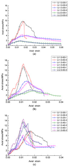 - Pore compression stage: This stage was more clearly distinct in the pure high-water materials (e.g., U-1.0-00, U-1.5-00, and U-2.0-00); as the water−cement ratio increased, the stage of pore compression became even more distinct (Figure 7a,b). But for MBM specimens, the scene became less precise as the doping amount of aeolian sand increased (Figure 7c). It would appear that the specimens with a larger water−cement ratio had a more remarkable pore compression stage. At the same time, the higher sand content that led to this stage was not significant. It may be because the doped aeolian sand particles filled the pores between the originally pure high-water material, reducing the number and space of pores.
