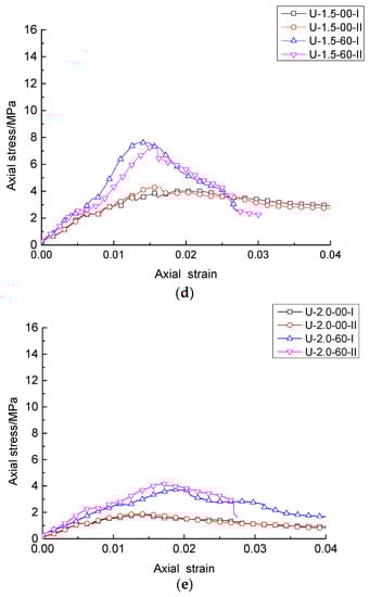 - Elastic deformation stage: This stage became less distinct and had a shorter duration for pure high-water materials (Figure 7a) and a low doping amount of aeolian sand (Figure 7c). However, as the water−cement ratio increased, this stage became less precise and had a shorter period (Figure 7a,b). In addition, as the doping amount of aeolian sand increased (Figure 7c–e), this stage became more distinct and had a longer duration. This phenomenon mainly dominated in the modified material samples U-1.0-60. It may be assumed that the more considerable amount of aeolian sand doped into the high-water material, the smaller the pores between aggregate particles. The friction between the aggregate particles could further increase due to the cementing effect of the high-water materials. Therefore, the inter-particle dislocation was more unlikely to happen.