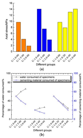 Consumption of raw materials: (a) Uniaxial compressive strength of specimens of different groups; (b) The percentage of water and cementitious material consumed by specimens of different groups.