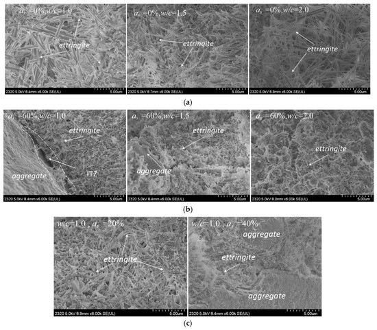 SEM images of MBM specimens: (a) as = 0% and three different w/c (1.0, 1.5, and 2.0); (b) as = 60% and three different w/c (1.0, 1.5, and 2.0) []; (c) w/c = 1.0 and different as (20% and 40%). Herein, as is the sand content, w/c is the water-cement ratio.