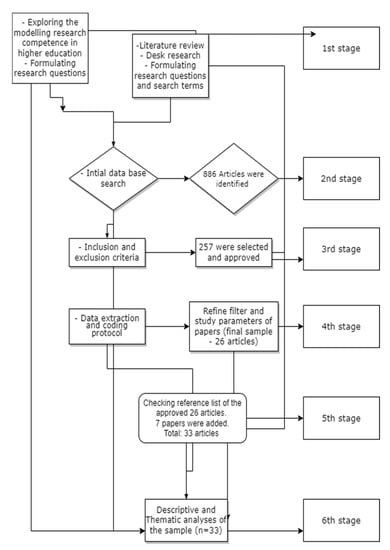 For our SCR, the quality criteria targeted the model of how RC is developed, the profile of competences necessary to undergo research during master programs, relevant input to research questions formulated for this SCR, valuable recommendations for future development of RC for master’s students, and forecasting future research trends (see Table 2). The quality criteria had been validated and coded by a group of experts for an efficient selection of articles. The process of identifying the most appropriate papers was challenging, mostly, because there are not so many comparative studies on RC development. Studies in Engineering Sciences do not focus on the teaching process of RC, therefore, in order to build up an understanding regarding the process of RC modelling, studies across other disciplines had been also included.