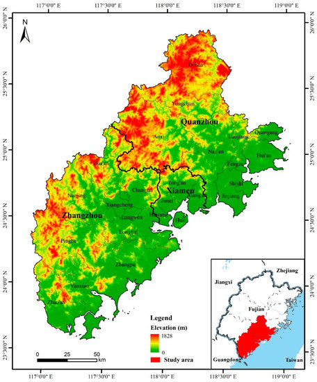 Located on the southeastern coast of China, the FDUA (116°53′–119°01′ E, 23°33′–25°56′ N) includes the cities of Xiamen, Zhangzhou, and Quanzhou, as shown in Figure 1. The region covers an area of 2.53 × 104 km2, accounting for 20.87% of the land area of Fujian Province. The region has complex geomorphological conditions and is a hilly and basin plain area. The inland landscape is mainly composed of low hills. The northern part of the area is high in altitude, effectively preventing cold air from traveling south and forming the natural green barrier of the FDUA. The southern part is mostly composed of a river valley basin and a coastal plain, which is significantly influenced by the subtropical maritime monsoon climate. The overall ecological environment is good, with a forest coverage rate of approximately 61.3%. However, due to the special topographic conditions of narrow coastal zones and limited buffering capacity, ecological security problems, such as damage to key ecological service functions, disturbances of ESPs, and decreasing security space, are particularly prominent. The cities and towns in the region are vulnerable to natural disasters, such as typhoons and floods.
