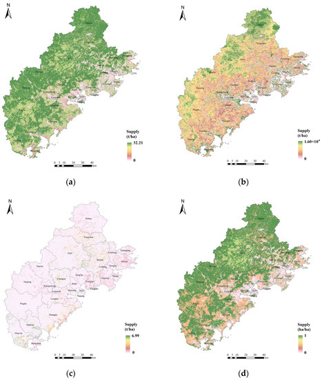 The average, maximum and minimum values of water provision of ESs in the study area were t/ha, t/ha, and 0, respectively. High values of water provision were concentrated in the northern, western, and southwestern parts of the study area, while low values appeared in the northeastern part and southeast coastal zone (see Figure 3). This pattern is attributed to the hydrological characteristics of the FDUA: rainfall rose from northeast to southwest, while surface runoff in the northeastern region was higher than in the western and northwestern regions of the study area.