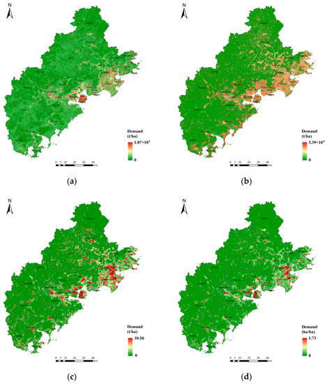The total grain consumption level was t, which means that grain production supply was insufficient and a considerable proportion of grain needed to be imported. The demand for grain production displayed a spatial pattern similar to that of carbon storage, as shown in Figure 4c. High demand primarily occurred in the densely populated northeastern coastal areas as well as inland urban residential areas.