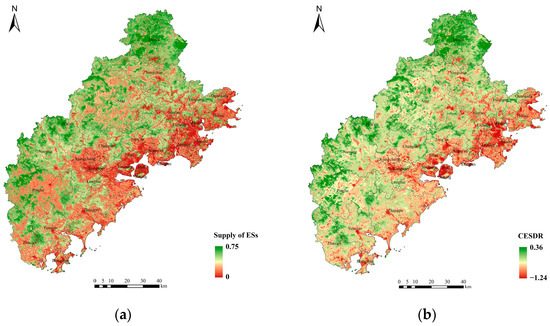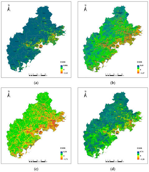 Whether the supply and demand of ESs are spatially well-matched can be measured by an indicator known as the ecological supply–demand ratio (ESDR), which can also indicate an ecosystem’s potential ability to maintain the sustainability of ESs [49,50].