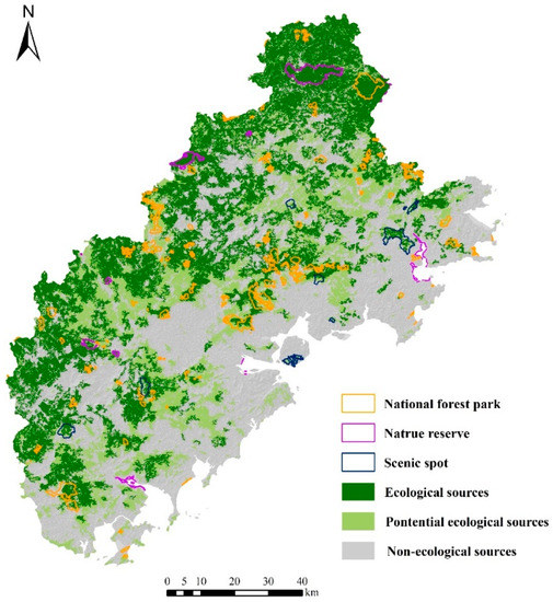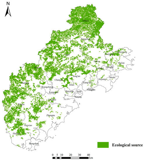 As shown in Figure 7, the identified ecological sources include 119 patches covering an area of 8359 km2, occupying 33.10% of the area of the FDUA. These patches were mostly located in the northern and western hilly and mountainous areas of the region. Some small patches were scattered east of the FDUA and were critical for maintaining the coastal protection function. These ecological sources were mainly composed of forestland, cropland, grassland, and shrubland, among which forestland dominated, accounting for 73.8% of the total ecological source area. There was significant variation in the distribution of ecological sources in different administrative regions, and the distribution was as follows: 53.83% in Quanzhou, 43.26% in Zhangzhou, and 2.91% in Xiamen.