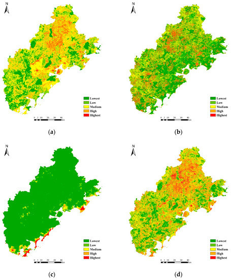 Ecological risk was used to measure the resistance surface coefficient, which reflects the hindrance to species’ migration. The results (Figure 8) show that the geological disaster risk tended to increase from the southern region to the northern inland region. Disaster risk grades by area were ranked as follows: moderate > high > lowest > low > highest, covering 36.02%, 24.11%, 20.04%, 15.79%, and 4.04% of the study area, respectively. The total area with the moderate, high, and highest geological disaster risk levels accounted for 64% of the total area, indicating that the geological hazard risk in the FDUA was generally high. In addition, the sensitivity of soil erosion was generally not high. Most areas were classified as of lowest- and low-sensitivity, accounting for 69.60% of the total area, and the highest-sensitivity areas accounted for 9.71% of the total area. Areas of high and highest sensitivity were scattered in hilly areas covered by red soil. Moreover, a few features resulting from human activities, such as land reclamation on slopes and destroyed vegetation coverage, affected soil erosion during rainfall events. As shown in Figure 8c, overall, the land desertification index values were mostly low. Land desertification risk was higher in the eastern coastal zone, mainly as a result of the marine climate, seawater erosion, and artificial effects of activities such as development and construction. The spatial characteristics of ecological risk are shown in Figure 8d. Regions of high and highest risks were concentrated in the northern region of the study area, including Anxi County and Yongchun County, where altitudes are higher and the population density is lower, and in the eastern coastal areas, including the cities of Shishi, Jinjiang, and Huli District, where land utilization is intensive and ecological conditions are fragile.