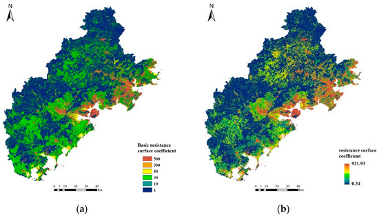 Spatial pattern of the ecological resistance surface coefficient: (a) basic resistance surface; (b) modified resistance surface.
