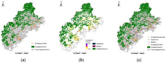 ESPs in the study area: (a) ecological corridor; (b) pinch points and barriers; (c) ecological break points.