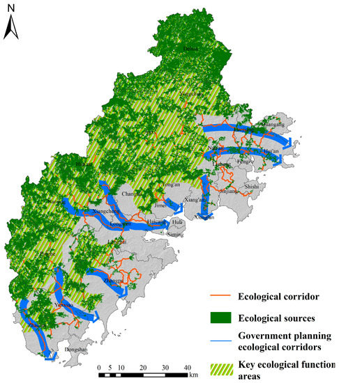 After overlaying the identified ecological sources with nature reserves above the province level, the overlapping area between the two accounts for 59.90% of the total area of the reserves, as shown in Figure 11. The coincident part includes the national forest park and nature reserve areas, such as the Daiyunshan nature reserve area and Shiniushan forest park, showing that the ESP is constructed with full consideration of areas critical to protecting the local ecological environment. Moreover, Figure 12 shows that most ecological sources are located within key ecological function areas planned by the government. The identified ecological corridors are spatially close to those planned by the government. Such spatial consistency proves the reliability of the method proposed in this paper. However, it should be noted that the coverage area of these nature reserves is relatively small, and the establishment of protected areas alone is not sufficient to meet ecological demands. In addition, current regional ecological protection policies still focus on the designation of ecological red lines that include forest parks, nature reserves, geological parks, critical scenic areas, wetland parks, world heritage sites, and so on. Ecological security is maintained through a policy of prohibiting land development within the ecological red line boundary to protect habitats of endangered species and ecosystems. Although policy has had some positive effects on the conservation of ecological lands, it does not adequately consider ecosystem structure and function or measure the supply and demand of ecosystems. The effects of ecological protection would be stronger if the delineation of the ecological red line could be integrated into the supply and demand of ecosystems.
