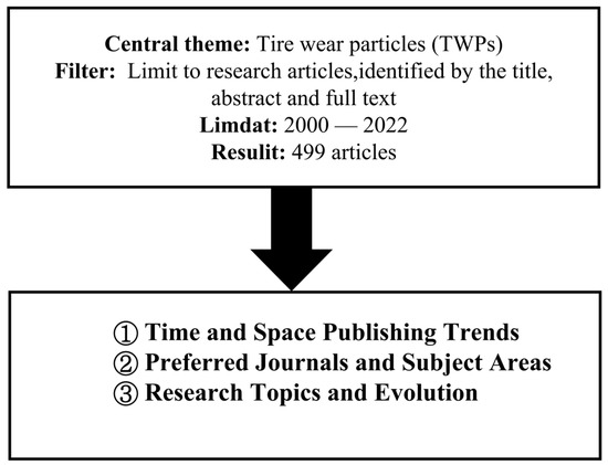We collected documents from the WOSCC and searched for them under the subject line “tire wear particles”. The document types were “articles” and “article reviews”, in English, and the article search timeframe was set from 2000 to 2021. After screening on the abstracts section, we eliminated papers with research directions on Computer Science Hardware Architecture and Nuclear Physics. A total of 499 valid documents were obtained. Literature record content exported a selection of full records with cited references, with records exported as tab-delimited files. The learning selection and learning flowchart are shown in Figure 1.