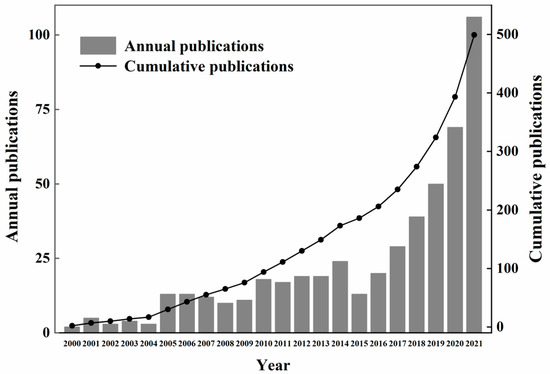 According to the screening results, a total of 499 papers related to the field of TWPs were published from January 2000 to December 2021. Results show an overall increasing trend of interannual variation in the number of publications (Figure 2). These included a slow growth in the number of publications from 2000 to 2013, with only 153 articles related to TWPs. However, from 2014 to 2021, the number of articles on TWPs showed an exponential growth trend, with 383 published public articles. In particular, 287 articles have been published in the last four years (2018–2021), accounting for 53.54% of the total literature. This indicates that TWPs are receiving increasing attention from investigators, particularly in the field of environmental science.