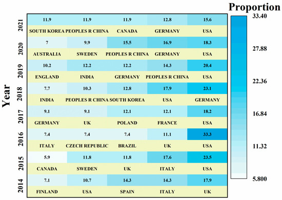 Statistics showed that the number of countries involved in research on TWPs were comparatively low until 2018, with the top five countries publishing over 65% of studies (Figure 3). Nevertheless, after 2018, research on TWPs has received more attention, with more countries involved in the TWP studies. The European Union and the United States have been at the forefront of research into TWPs. Among them, the USA has been in the top five in terms of relevant publications and has made significant contributions to TWP research. Notably, the number of articles published in this field by Germany has increased significantly since 2019, with more than 12% of articles coming from German researchers. Developing countries such as Brazil, China, and India have been gradually paying more attention to research on TWPs in recent years and have also shown considerable progress in terms of publications.