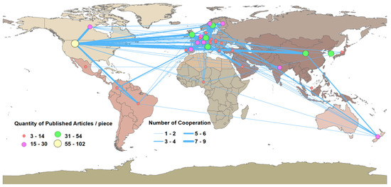 This study counted the annual number of publications in the field of TWPs based on the WOSCC analysis function and analyzed the interannual trend of the number of published publications using Origin 9.2.1 software (Origin for OriginLab, Version 9.2.1, Northampton, MA, USA). Based on the 2021 edition of the WOSCC citation report, we counted the number of articles in the source journals and further analyzed the total citation frequency, average number of citations per article, and impact factor of the top ten journals in terms of number of publications. To begin with, the international cooperation model was based on national units. Documents published in England, Scotland, Wales, and Northern Ireland were unified into the United Kingdom, and documents published in Taiwan Province, Hong Kong, and Macao Special Administrative Region of China were unified into a Chinese collection [26]. Then, based on the comprehensive counting method in the visualization software VOSviewer 1.6.11 (VOSviewer for CWTS, Version 1.6.11, Leiden, Netherlands), the number of articles published by countries was counted, and the number cooperation among the top 20 countries in terms of the number of issued articles was calculated. On the basis of countries’ geographical location and cooperation frequency between countries, ArcGIS was used to map the international cooperation network.