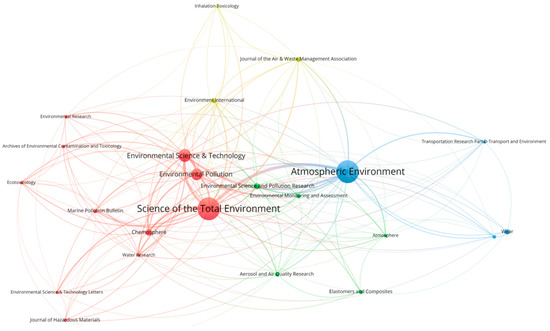 A plot of the core-citation network of the top 23 journals shows each node as a journal, and the connection between the nodes indicates that there is a citation relation between the two documents (Figure 5). The thickness of the line is proportional to the co-citation strength of the two journals being linked, whereas the node size is related to the total link strength maintained by the journal. Science of the Total Environment, Atmospheric Environment, and Environmental Science Technology are the top three journals in terms of citation counts and total link strengths. Environmental Science Technology, although with slightly fewer publications, has the highest average citation count. It is worth noting that some articles not published in mainstream journals are also of research value, such as a study proposing a method to force TWPs into tunnels to prevent their release into the environment [32]. The method is environmentally friendly and convenient and can provide guidance for reducing the pollution caused by TWPs.