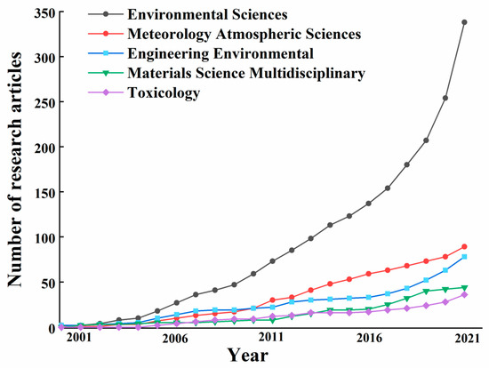 The results of the journal citation analysis reflect the research areas that provided the most information on TWPs. As shown in Figure 6, the five most relevant subject areas included “Environmental Sciences”, “Meteorology Atmospheric Science”, “Environmental Engineering”, “Materials Science Multidisciplinary”, and “Toxicology”. The field of “Environmental Sciences” (338, 62.942%) is a research hotspot for TWPs, especially after 2018, with an exponential increase in the number of publications. The growth rate of “Environmental Sciences” publications reached 33.07% in 2021, being the fastest growing field. With the expansion of the study of TWPs over decades, more general areas of study have emerged, such as “Toxicology”, which appeared in 2006. This increase can be related to the release of endogenous heavy metals (lead, cadmium, mercury, hexavalent chromium, etc.) [33] and derivates of various organics (6PPD-Q, PBBs, etc.) [34] during the process of tire wear and tear.