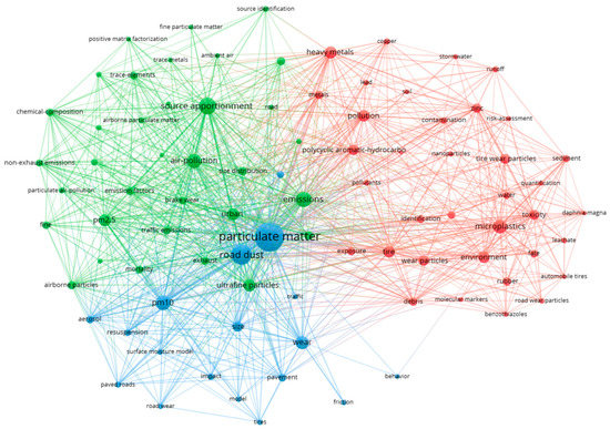 In total, there were 88 keywords covered by literature sources in the research area of TWPs from 2000 to 2021. Among them, “Particulate matter” (205 times), “Road dust” (111 times), “Source apportionment” (83 times), “Emissions” (70 times), and “PM10” (66 times) were the top five keywords in terms of frequency of occurrence (Table 2). The correlation between keywords is shown in the network visualization chart. Various colors indicate that keywords belong to different clusters, and node size indicates the frequency with which keywords appear. As shown in Figure 7, TWP study consists of three major topical groups: suspended particulate matter (blue), air pollution sources (green), and environmental MP (red).