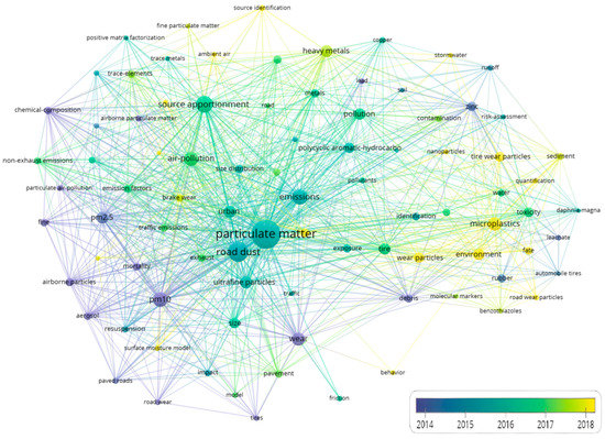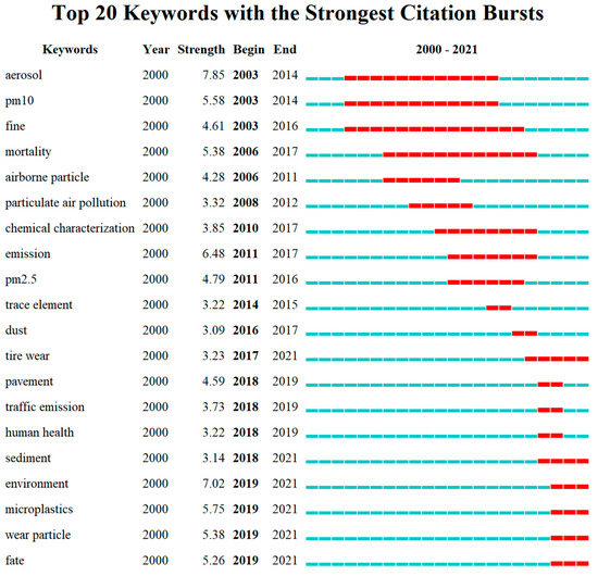 By using the Citespace burst detection feature, we can locate the exact year a keyword appeared. A total of 20 keywords are shown in Figure 9, where blue segments represent the time span of all documents and red segments represent years from appearance to termination of matching keywords. As can be seen from the chart, the earliest and most powerful keyword is aerosol, explaining that earlier studies focused on the properties of particulate matter in the atmosphere, which further interprets the high frequency of “PM10” and “PM2.5”. The main reason is that particulate matter from road traffic can be distinguished according to its source, as particulates associated with tailpipe traffic emissions and non-tailpipe traffic emissions [46]. The former are generated during combustion due to inadequate combustion of fossil fuels and volatilization of additives, while the latter are generated by non-tailpipe traffic-related sources or are already present in the environment as deposited material and resuspended due to turbulence caused by vehicle movement [37]. Exhaust particles have been well studied and characterized, and technological improvements have led to significant reductions in their emissions [47,48]. Therefore, as the focus of the research shifted, questions about the physicochemical characteristics, emission factors, and potential environmental hazards of TWPs generated by non-exhaust processes gradually have been attracting more and more attention.