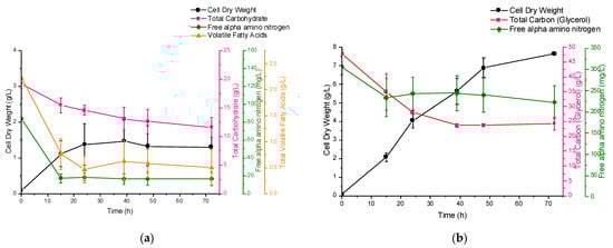 Time course profile for growth and utilization of nutrients by B. thailandensis during batch fermentation using: (a) Food waste hydrolysate; (b) Glycerol.